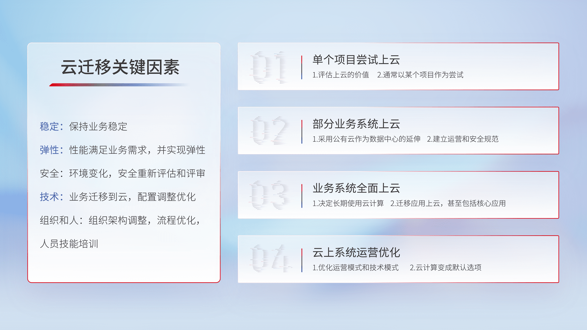 结合实际业务,,从规划设计、、云平台选型、、云原生改造、、、、数据迁移、、、集成交付,,迁移全过程为客户识别最佳上云路径,,,,做好风险识别管理,,,,设计网络架构、、身份权限、、、安全审计合规、、、操作审计、、日志审计、、、监控告警策略、、、多站点容灾设计等,,对云上基础设施进行整体规划,,提升IT治理水平,,,,以满足弹性、、、高可用、、、、高性能的需求。。。。